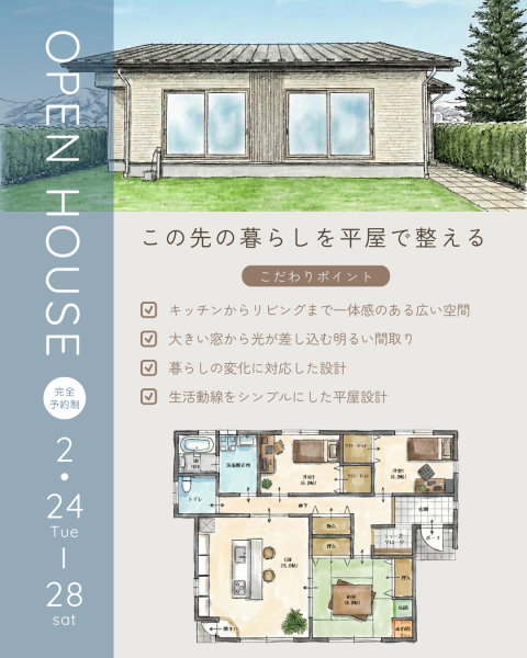 トップ > (株)宮沢工務店 > イベント情報 > 「この先の暮らしを平屋で整える」実際に見て体感できるチャンス 【完全予約制】
